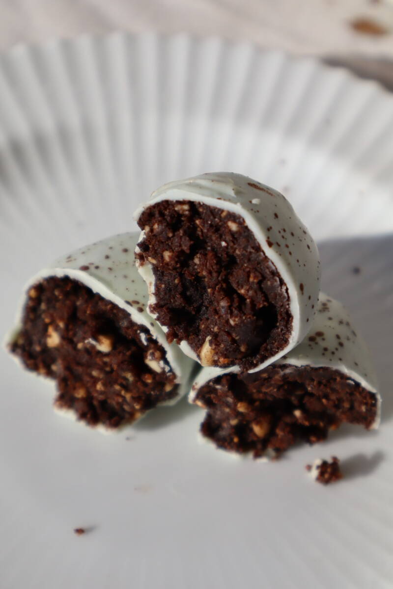 Søde påskeæg lavet af dadler, peanutbutter, kakao og ristede hasselnødder.