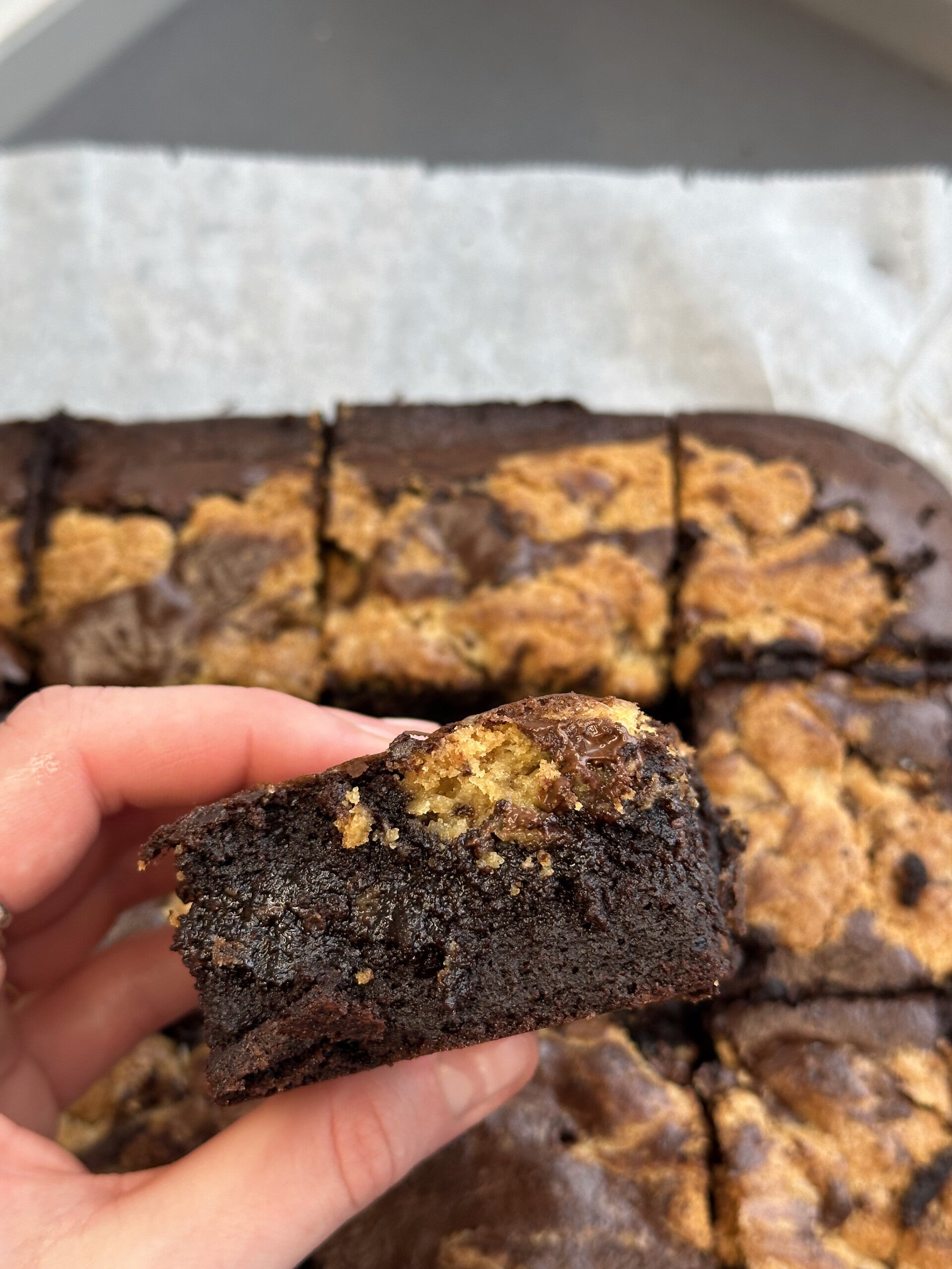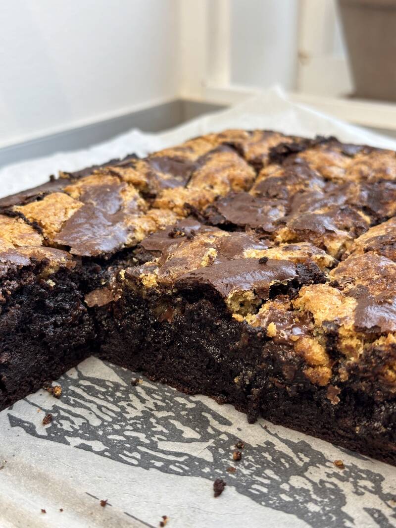 En kage med to gode smagskombinationer, nemlig cookie og brownie.