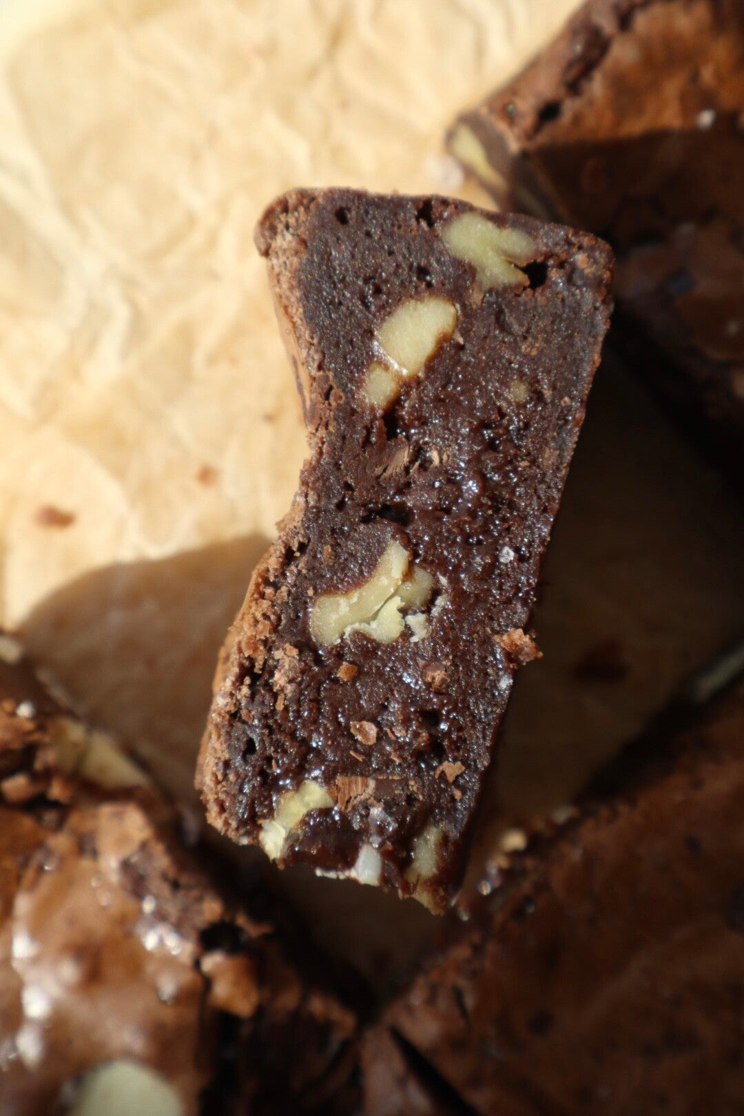 Den ultimative fudgy brownie – sprød top, blød midte, chokolade og nødder i hver bid.